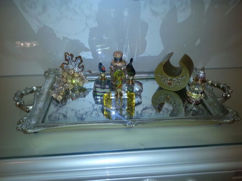 Kuğu cam aksesuarlar Swarovski’ den. Tepsideki parfüm şişeleri yurtdışında farklı seyahatlerden anılar… Üzüm salkımı ise