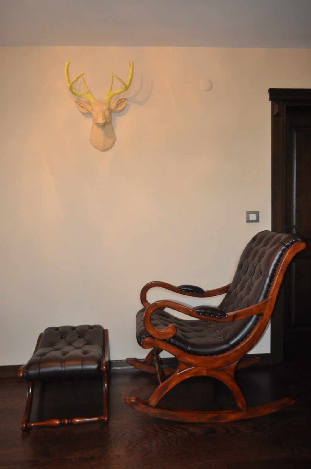 Çatı katının çok fonksiyonel değerlendirildiği bir ev burası. Rahat koltuklarda televizyon izleyebilmek için fasulye şekil bir grup seçilmiş Vatan Mobilya’ dan. Pufla geniş koltuğun düz hatlarını kırmak içinse bu yılın en trend desenli kumaşlarından kaplanmış. Sallanan sandalye yine evde nostaljik unsurları seven çiftin Kervan’ dan tercihi olmuş, hemen üstündeki geyik başı ise Amerika’ dan alınmış.