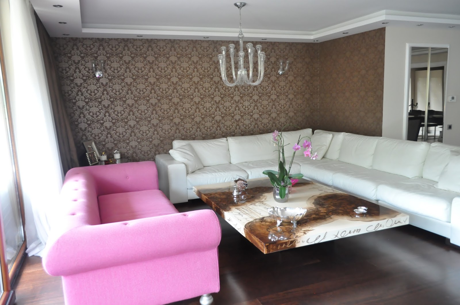 Salonun oturma bölümünde Natuzzi’ den L koltuk seçilmiş; pembe renkli geniş olan ise son derece rahat ve rengi itibariyle salona canlılık katmış. Bu alandaki aydınlatma Baccarat’ tan. Bence salonun en tarz detayı İsmet Mobilya’ dan alınmış olan desenli lake orta sehpa. Mağazada belki fazla iddialı durabilecek bu parça doğru mobilya seçimleriyle kombinlendiğinde ortama yaratıcı bir hava katmış.