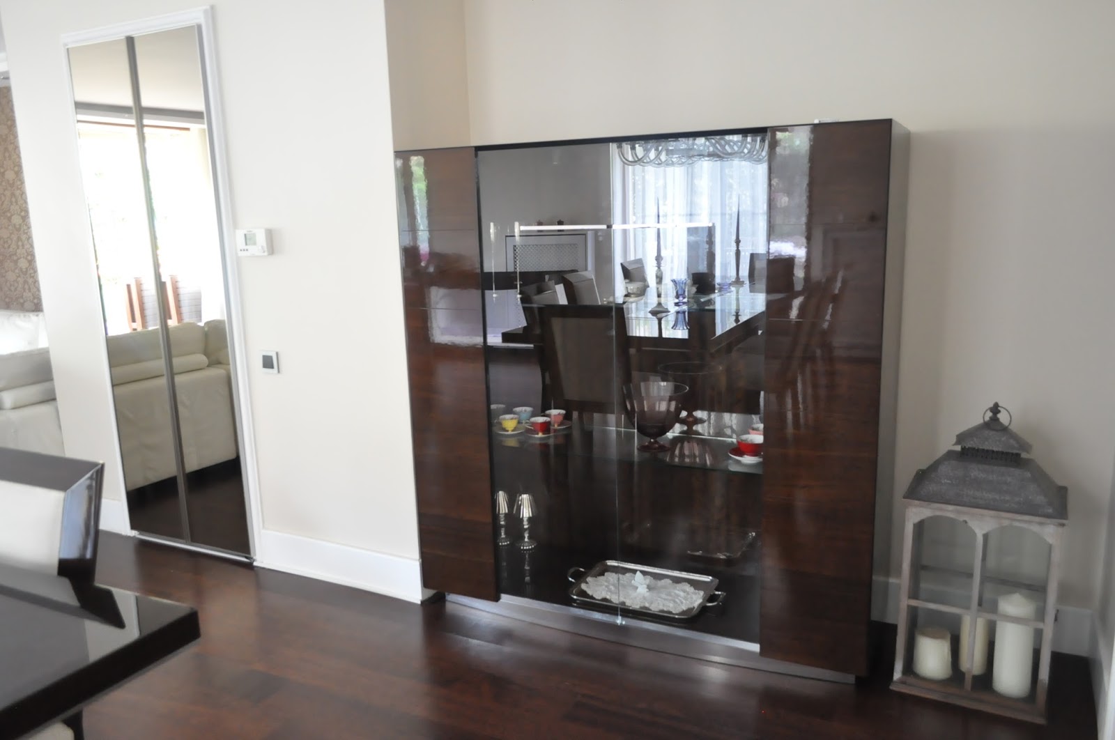 Yan duvarda görülen aynalı kapı orada bulunması gereken tesisatla ilgili bağlantıları kamufle etmek için şık bir yöntem.
