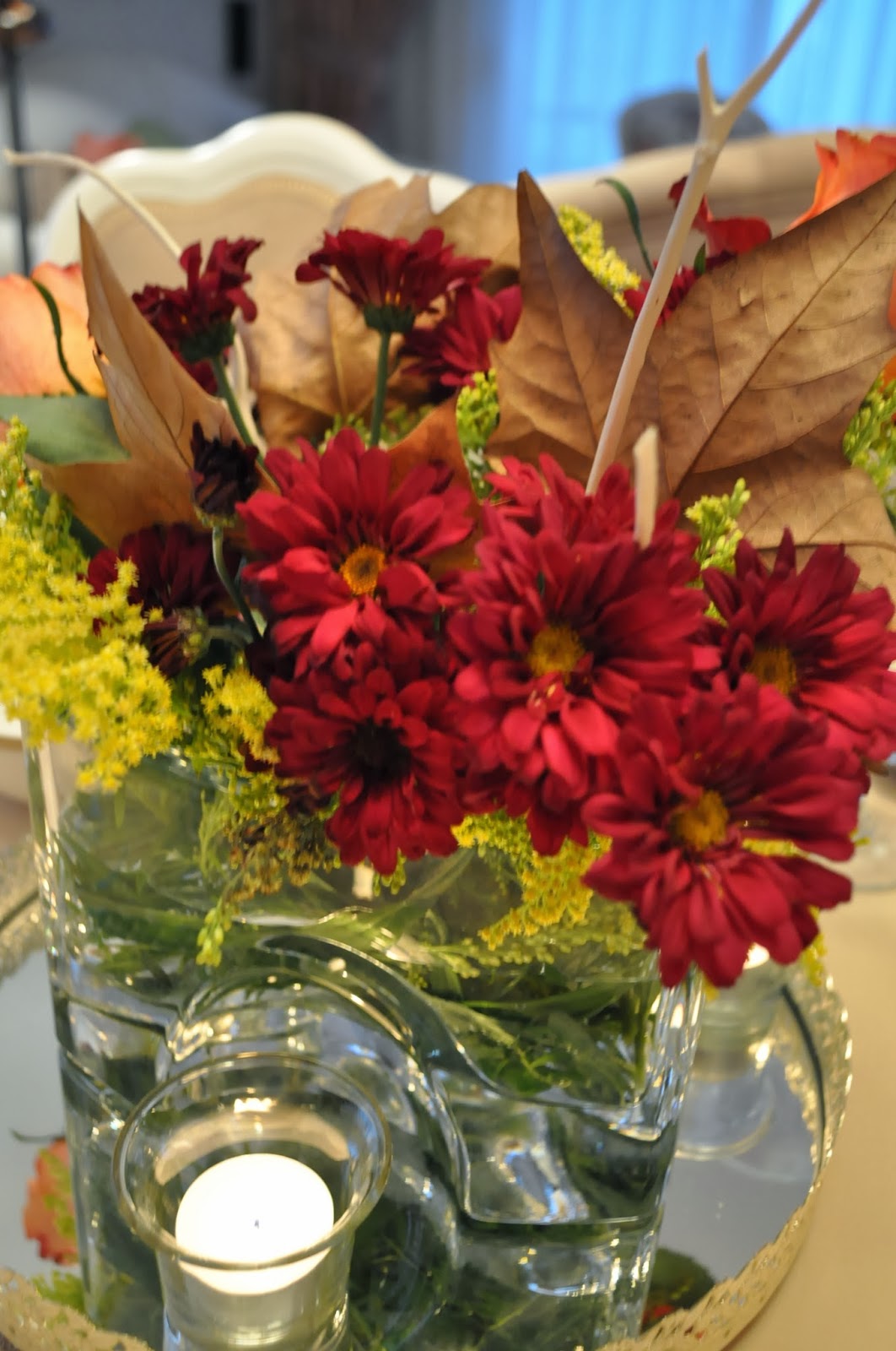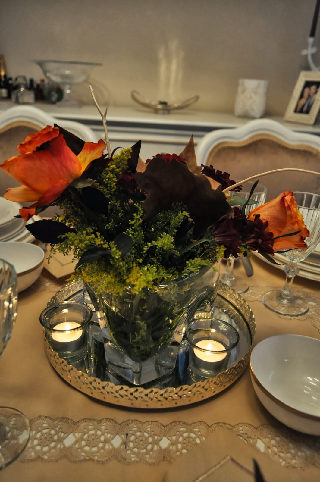 Yemekler tamamlandıktan sonra sofra dizaynını bitirip çiçekçiden aldığım biçme ve gülleri tanzim ettim. Evde bulunan kuru dallardan ve eşimle parktan topladığımız kuru yapraklardan da araya katınca tam bir sonbahar bir aranjmanı ortaya çıktı.