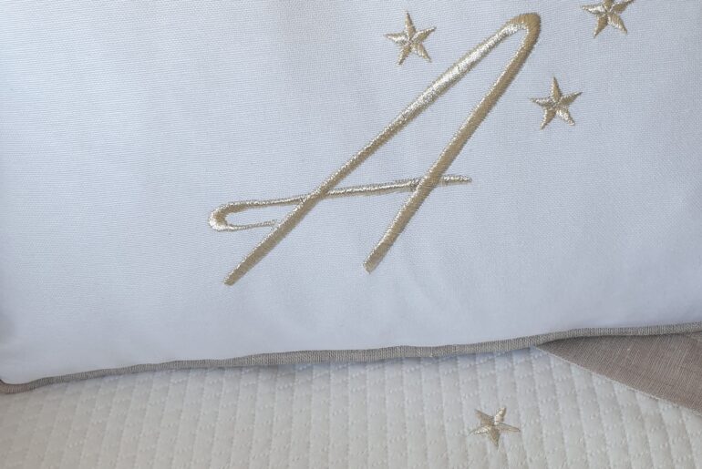 Ada için de yıldızlı bir modelde karar kıldık. Rengini de yıldıza en yakışacak saf gümüş iple kombinledik. Gökyüzünde ışıltıları indirdik.  Asıl takımında yastığa ada işlediğimiz için pike takımı anne yanı yatağında kullanılacağından  boyutları mecburen daha küçük tuttuk, o sebeple de sadece baş harf olarak nakışla istedik. Böylelikle takı yastığı olarak da kullanılabildi. Pike patında ise griye kombin olacak, sıcak tonların geçtiği bir gri tülde karar kıldık.