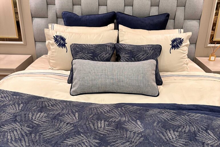 Diğer takım bol yastıklı olduğundan her müşterinin bu şekilde tercih etmeyeceğini de bildiğimizden bu takımı daha az kırlentle oluşturduk. Bazda iki büyük kırlentin ardından nevresim yastıkları geldi, sonrasında runnerdaki palmiyeleri tamamlayacak iki kırlent ekledik. Elbette yatak başındaki buz mavisini takımda bir yerlerde kullanmazsak arada kopukluk olacaktı. Hemen o renkten de bir adet kırlenti araya aldık.
