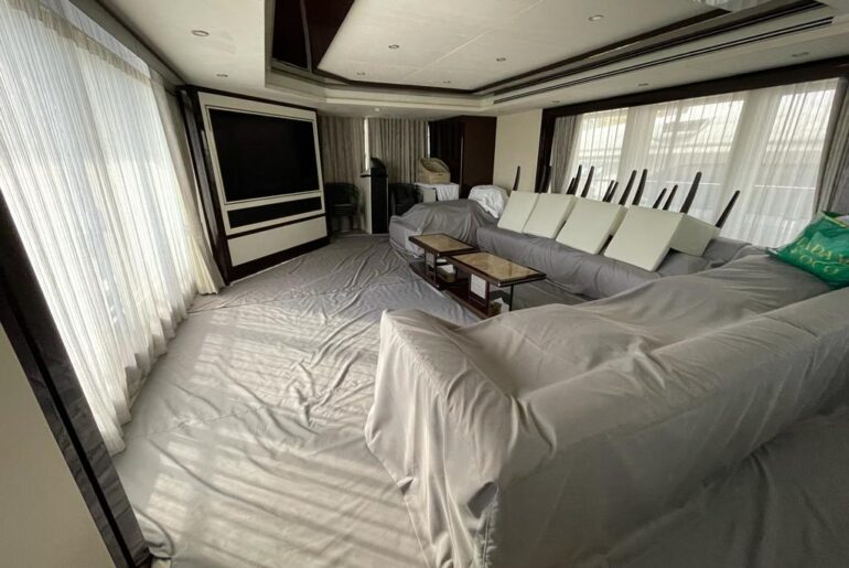 Gelin yakından inceleyelim bunlar nelermiş. İlk ve ikinci fotoğrafta gördüğünüz üzere zemin ve mobilyalar için koruma kılıfları diktik. Görselde hepsini görmüyorsunuz ancak bu süperyattaki aklınıza gelebilecek her zemin ve her mobilya parçası için ayrı koruma kılıfları boyutlandırılıp dikildi. Yatlar sezon dışına alınıp bakımları yapılırken içinde yer alan ürünlerin de iyi korunması gerekiyor. Bu sebeple her bir parça için ayrı özen gösteriliyor. Sonrasında kalıcı olmaları, yıpranmamaları ve kaybolmaları için ait olduğu mobilya ve odalar için nakışla isim etiketleri işlenip üzerlerine dikildi. Çok geniş alanlar ve parçalar söz konusu olduğu için hepsine farklı birleşim ve katlama yerleri oluşturuldu
