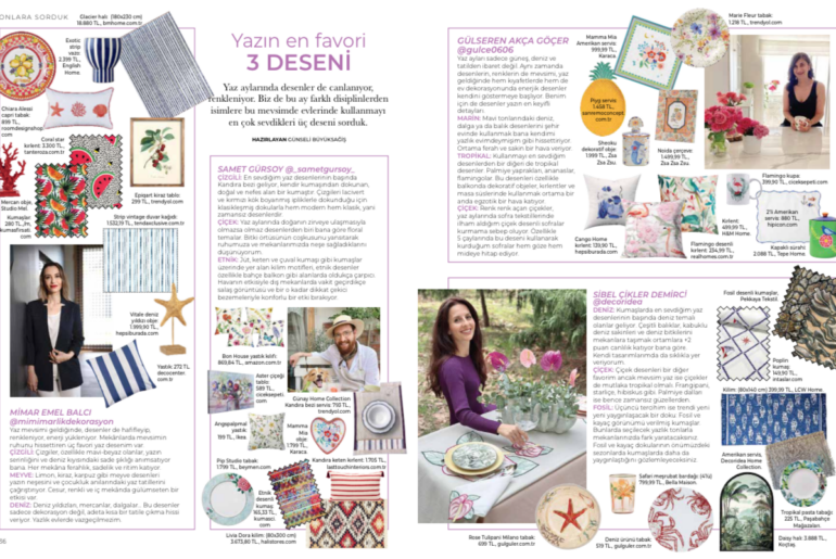 Basında arşivimize yeni bir ekleme yapıyoruz. Zaman zaman fikirlerime yer veren, çeşitli yazılar kaleme almamı rica eden Türkiye’ nin en keyifle okunan, takip edilen dergilerinden biri olan Evim dergisinde temmuz ayında da yine minik bir köşem vardı. Buradan duyurmakta biraz geciktim ama arşivimizi ihmal etmeyelim 😉 Yazın 3 favori desenini sordular ben de kaleme aldım. Elbette yine alışılmışın dışında tespitlerim olacaktı. Not alın, zaman içinde gözlemleyeceğiz. Evim dergisine tekrardan teşekkür ediyorum.