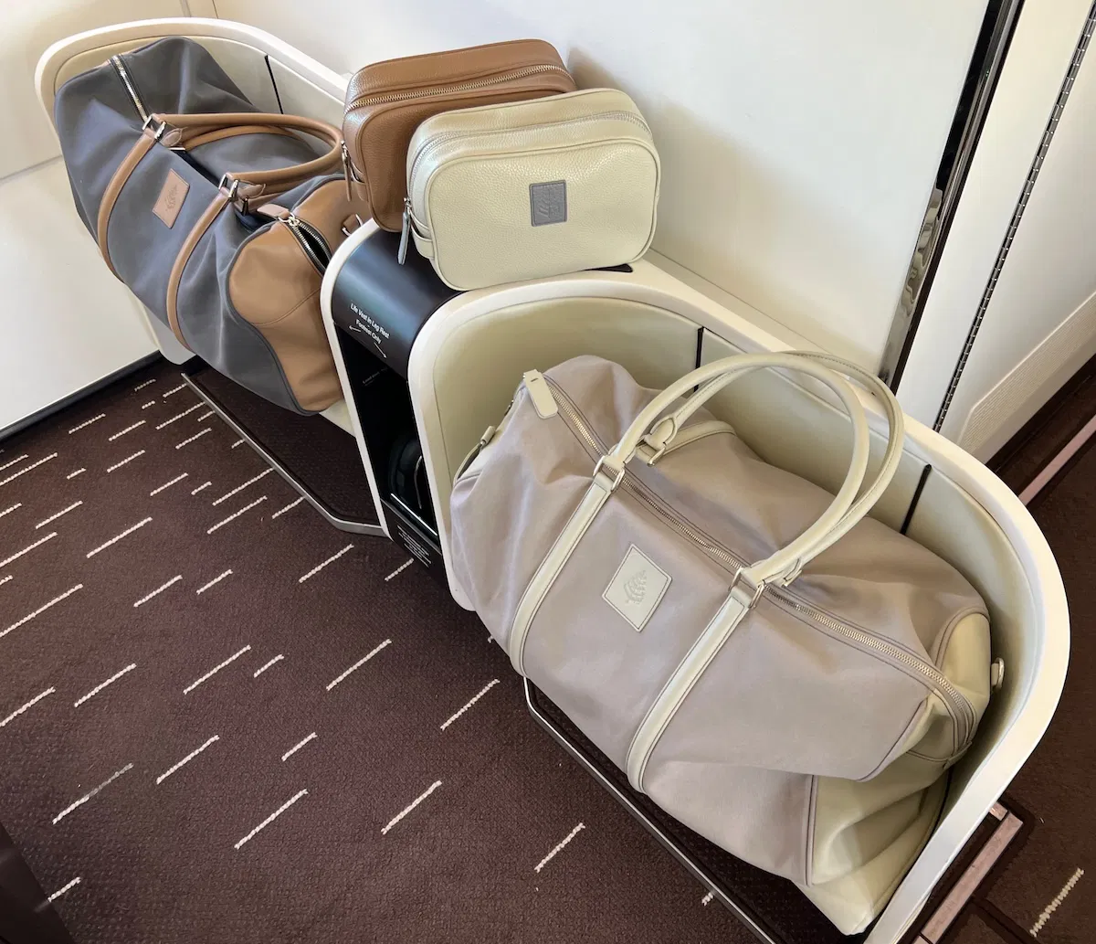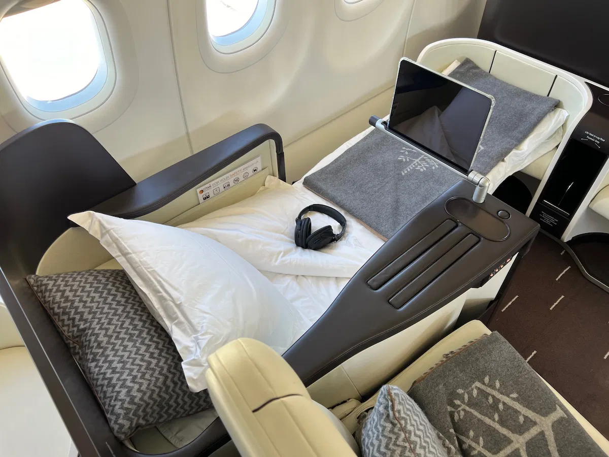 Biraz uçak içi konfordan da bahsedeyim. Koltukların İtalyan derisi kaplı olması, neredeyse 2 metreye yakın kişisel alan, extra ayak pufu birkaç özelliği. Koridorun da sosyalleşme anları için olabilecek en iyi ölçülerde olduğunu belirteyim. Uçağa bindiğiniz anda kişisel kullanımınız için bu gördüğünüz seyahat çantaları sizin oluyor, standart uçuşa tezat olarak FS battaniyesi de sizin oluyor. Yine uçuş içi kullanım için herkese özel birer Ipad ve Bose kulaklık ( bu da sonrasında sizin) temin ediliyor. Menüler genellikle gidilecek destinasyondan ilhamını alıyor ancak daha özel bir şeyler mi istiyorsunuz? Elbette mümkün.
